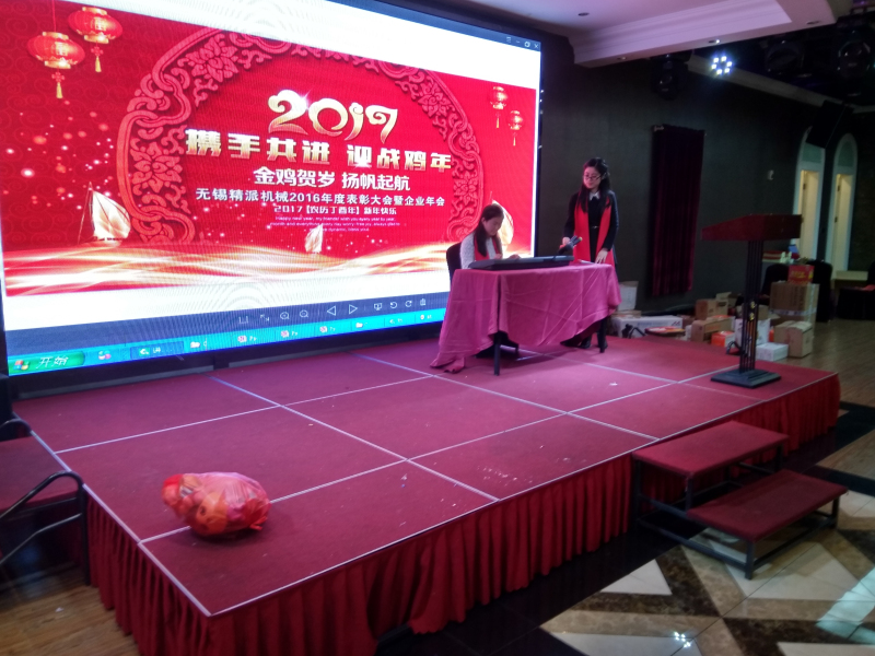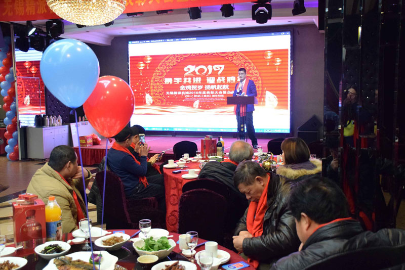17时,晚会正式开始。首先回顾了无锡精派机械2016年的光辉历程,紧接着公司总经理王立新先生致贺词并介绍了现场嘉宾,王总说:紧张忙碌的2016年已经过去,公司在全体员工的努力下,取得了前所未有的销售成绩。希望2017年再接再厉,全体员工共同努力,圆满完2017年各项公司目标,预祝大家合家欢乐,身体健康,万事如意。