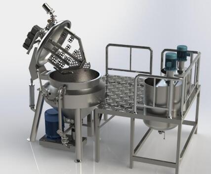 锅盖及其混合和均质系统为自动提升型。 可以在真空状态下通过输送管道将水锅和油锅中的物料直接吸入乳化锅中,而排放方法是将乳化锅体翻转过来。 锅套中的导热介质由电加热管加热,实现物料的加热,加热温度可任意设定并自动控制。 通过在中间层中连接冷却水可以冷却材料,并且操作简单方便。 绝缘层设置在中间层的外部。 均质搅拌和桨式搅拌可以分别使用,也可以同时使用。 材料的微粉化,乳化,混合,均质化,分散等可以在短时间内完成。
