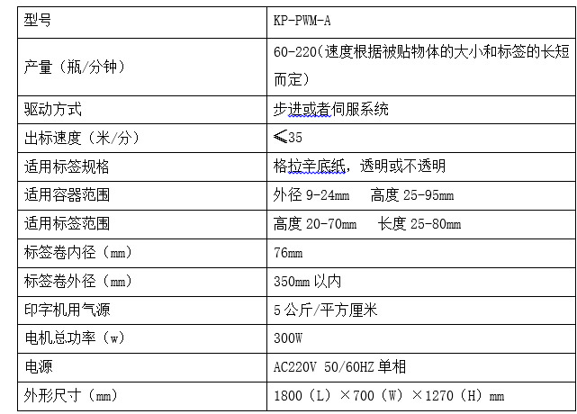 根据贵司需在瓶子平面贴标的贴标要求并根据产品的特点,我们诚意推荐使用我司生产DPM-A平面贴标机,它由一个贴标标站组成,输送带为链板式传